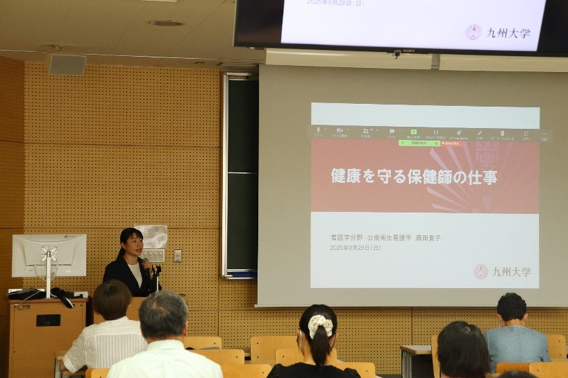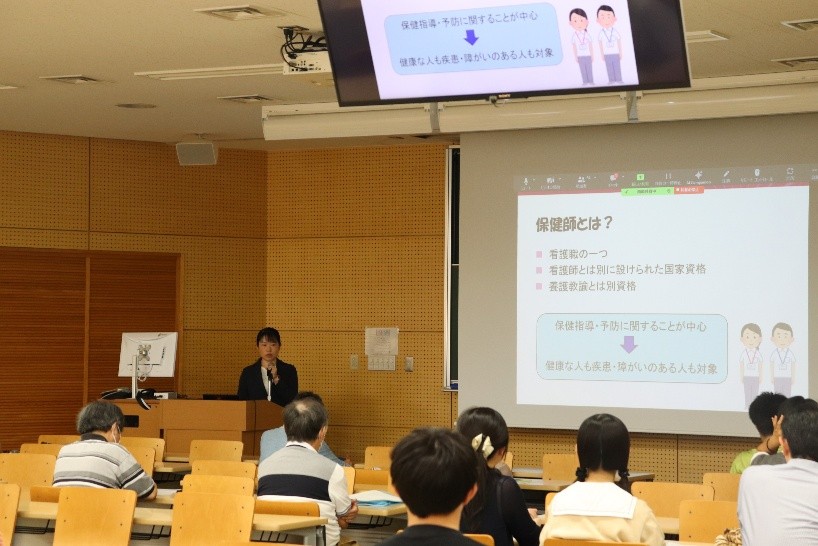 高校生や一般市民を対象とした公開講座が開催されました。講演は、オンラインでも配信され、多くの参加がありました。看護学分野からは、藤田貴子准教授により「健康を守る保健師の仕事」についてのご講演があり、保健師の多様な役割や活動内容について理解を深めることができ、大変貴重な学びの機会となりました。