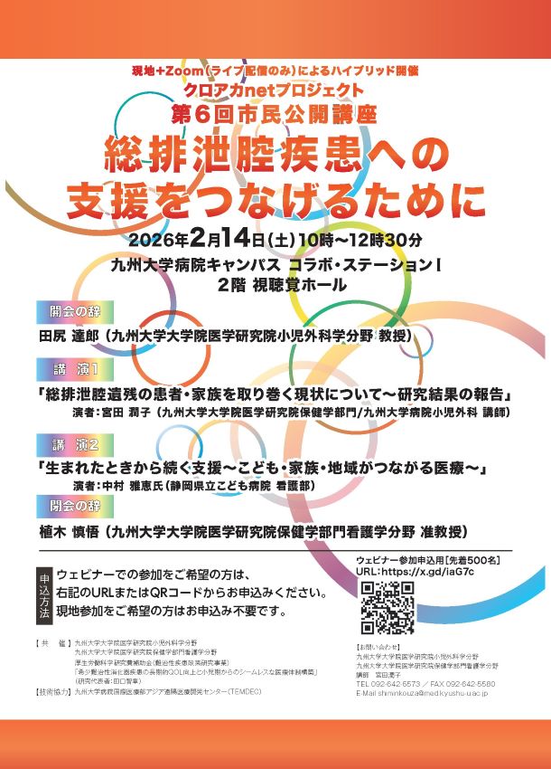 先天性難治性稀少泌尿生殖器疾患「総排泄腔遺残症・総排泄腔外反症」に関連して、下記の通り、オンライン市民公開講座を開催いたします。